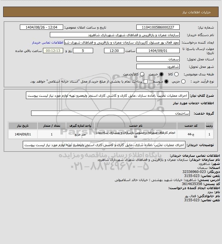 تلفن:5- 88349670 (021) فکس: 88349673 (021) Website: www.ParsNamadData.com E-mail: Info@ParsNamadData.com استعلام اجرای عملیات تخریب اماده سازی عایق کاری و کاشی کاری استخر ولیعصرو تهیه لوازم مورد نیاز لیست پیوست