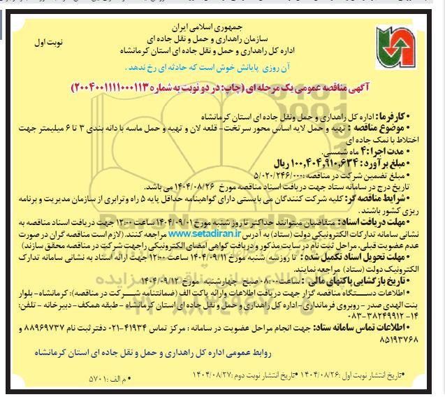 آگهی گزار اداره کل راهداری و حمل و نقل جاده ای استان کرمانشاه