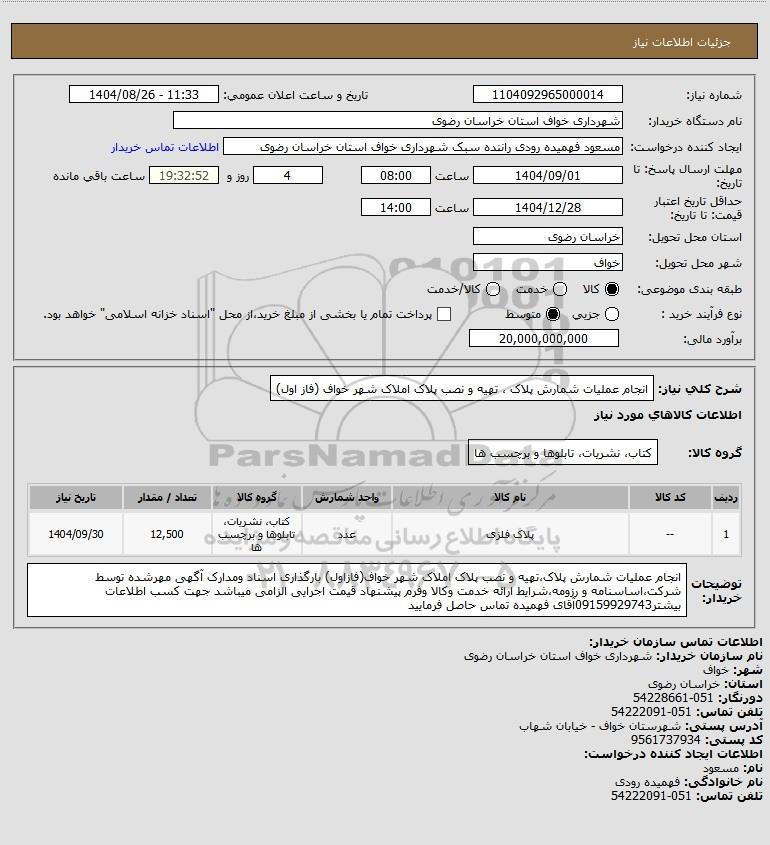 تلفن:5- 88349670 (021) فکس: 88349673 (021) Website: www.ParsNamadData.com E-mail: Info@ParsNamadData.com استعلام انجام عملیات شمارش پلاک تهیه و نصب پلاک املاک شهر خواف (فاز اول)