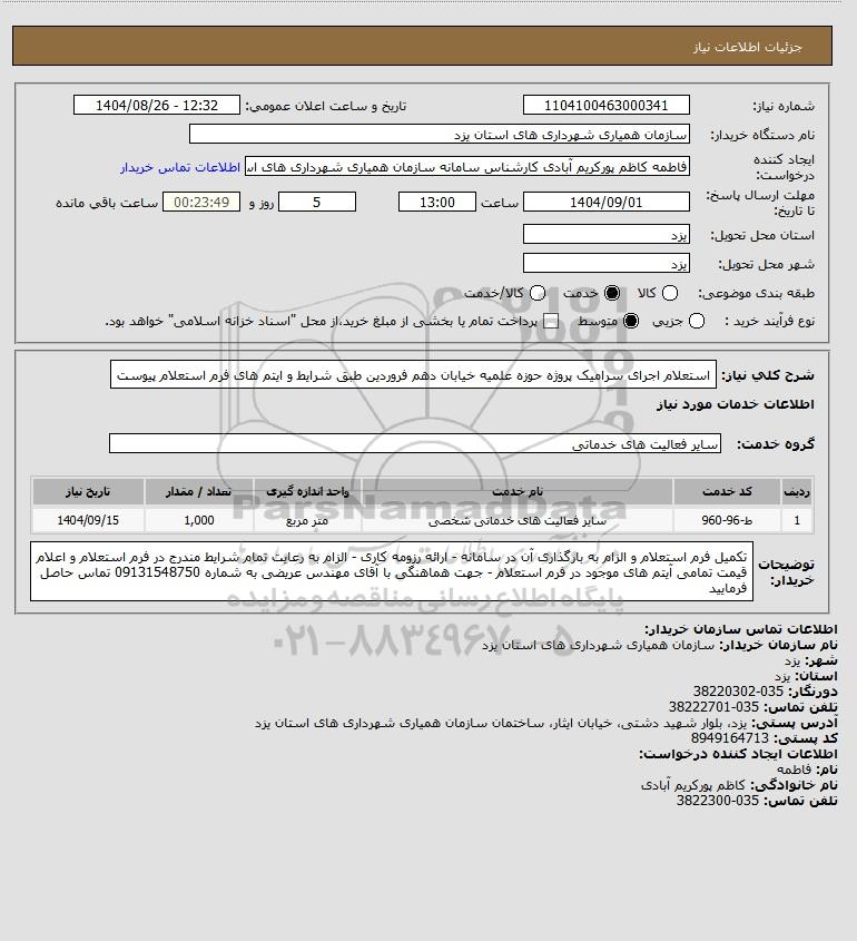 تلفن:5- 88349670 (021) فکس: 88349673 (021) Website: www.ParsNamadData.com E-mail: Info@ParsNamadData.com استعلام استعلام اجرای سرامیک پروژه حوزه علمیه خیابان دهم فروردین طبق شرایط و ایتم های فرم استعلام پیوست
