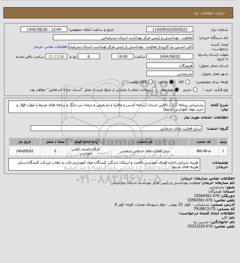 تلفن:5- 88349670 (021) فکس: 88349673 (021) Website: www.ParsNamadData.com E-mail: Info@ParsNamadData.com استعلام پشتیبانی برنامه کنترل ناقلین استان (برنامه آئدس و مالاریا و تشخیص و درمان تب دانگ و برنامه های مرتبط با موارد فوق و خرید مواد آموزشی مرتبط)