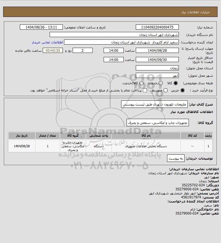تلفن:5- 88349670 (021) فکس: 88349673 (021) Website: www.ParsNamadData.com E-mail: Info@ParsNamadData.com استعلام ملزومات تلوزیون شهری طبق لیست پیوستی