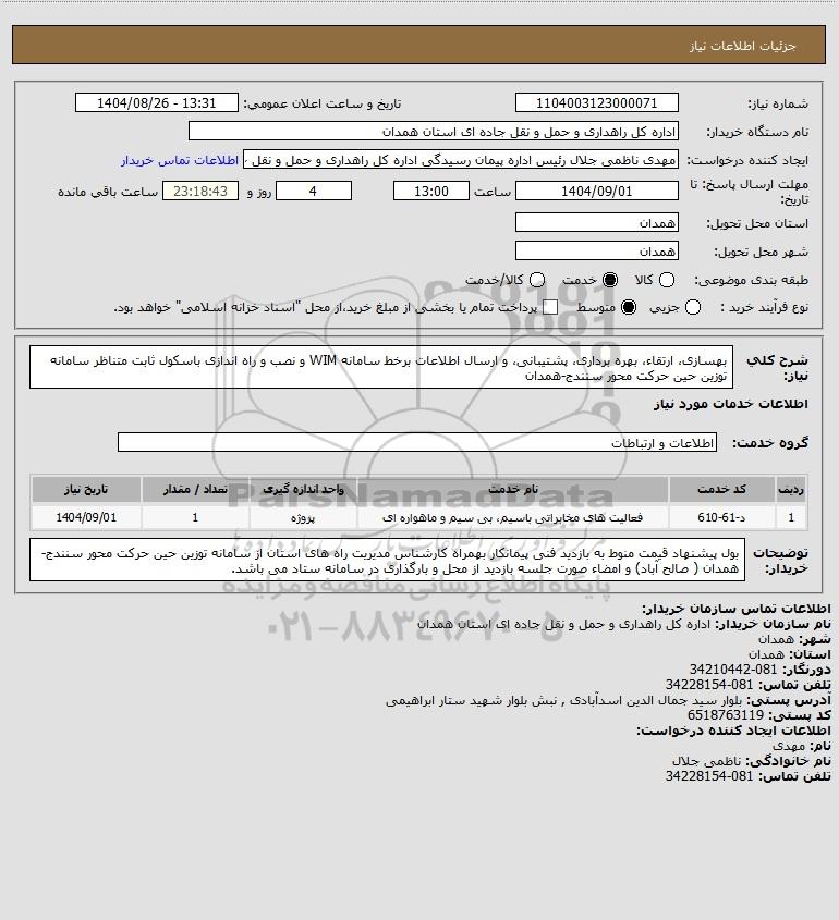 تلفن:5- 88349670 (021) فکس: 88349673 (021) Website: www.ParsNamadData.com E-mail: Info@ParsNamadData.com استعلام بهسازی ارتقاء بهره برداری پشتیبانی و ارسال اطلاعات برخط سامانه WIM و نصب و راه اندازی باسکول ثابت متناظر سامانه توزین حین حرکت محور سنندج-همدان