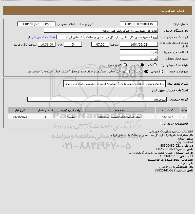 تلفن:5- 88349670 (021) فکس: 88349673 (021) Website: www.ParsNamadData.com E-mail: Info@ParsNamadData.com استعلام ساخت و تجهیز سایبان سقف پارکینگ محوطه اداره کل بازرسی بانک ملی ایران