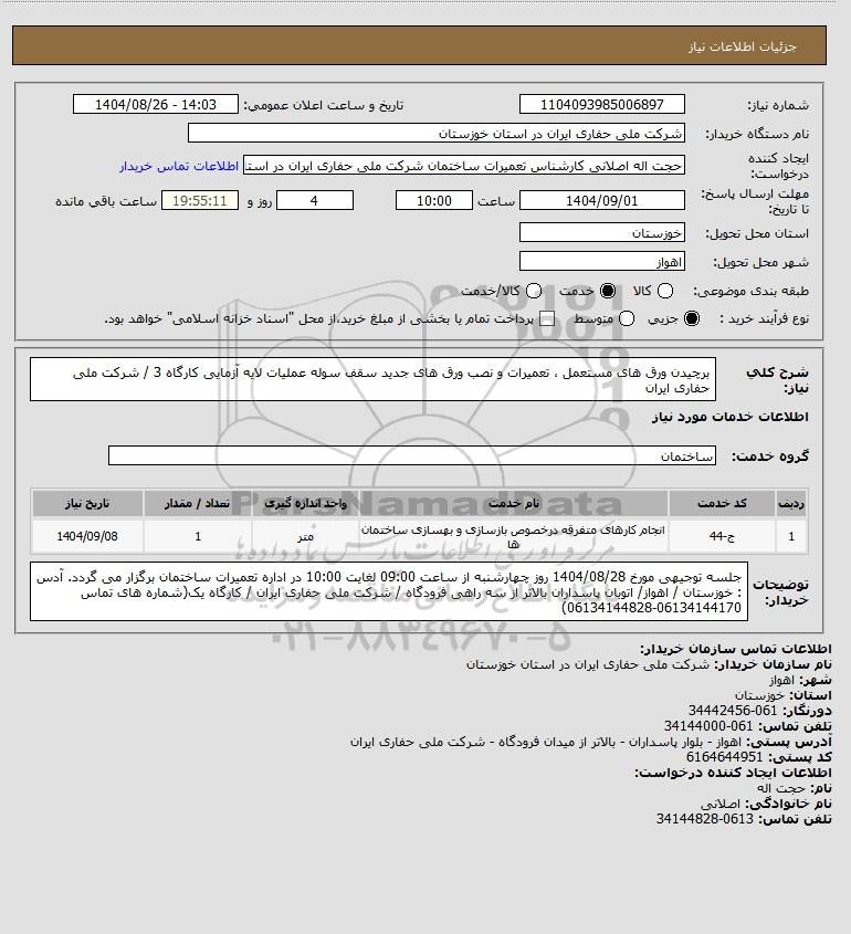 تلفن:5- 88349670 (021) فکس: 88349673 (021) Website: www.ParsNamadData.com E-mail: Info@ParsNamadData.com استعلام برچیدن ورق های مستعمل تعمیرات و نصب ورق های جدید سقف سوله عملیات لایه آزمایی کارگاه 3 / شرکت ملی حفاری ایران