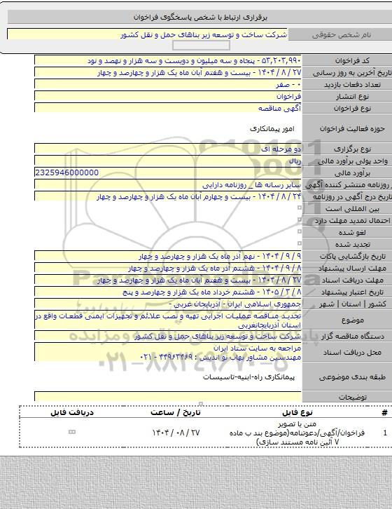 تلفن:5- 88349670 (021) فکس: 88349673 (021) Website: www.ParsNamadData.com E-mail: Info@ParsNamadData.com مناقصه تجدید مناقصه عملیات اجرایی تهیه و نصب علائم و تجهیزات ایمنی قطعات واقع در استان آذربایجانغربی
