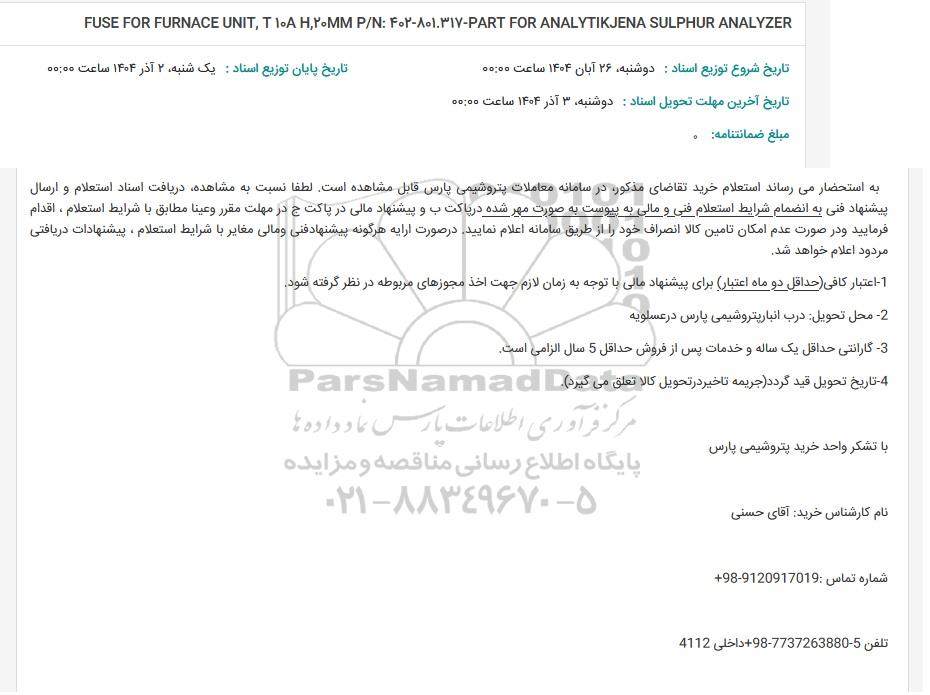 | عنوان آگهی: استعلام FUSE FOR FURNACE UNIT, T 108 2,20MM ... |