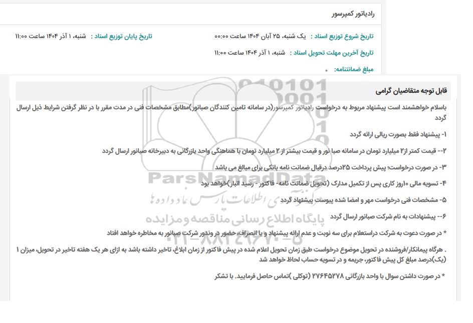 با سلام خواهشمند است پیشنهاد مربوط به درخواست رادیاتور کمپرسور در سامانه تامین کنندگان صبانور) مطابق مشخصات فنی در مدت مقرر با در نظر گرفتن شرایط ذیل ارسال گردد