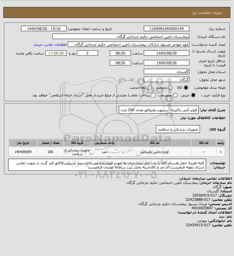 تلفن:5- 88349670 (021) فکس: 88349673 (021) Website: www.ParsNamadData.com E-mail: Info@ParsNamadData.com استعلام فیلتر آنتی باکتریال سرتیوپ ونتیلاتور تعداد 200 عدد