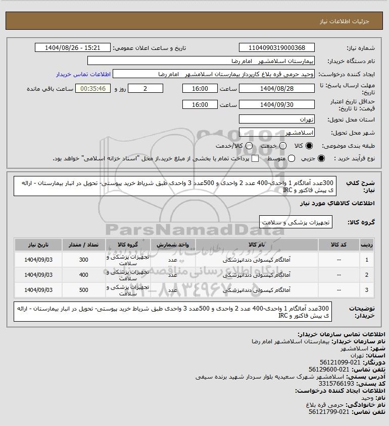 تلفن:5- 88349670 (021) فکس: 88349673 (021) Website: www.ParsNamadData.com E-mail: Info@ParsNamadData.com استعلام 300عدد آمالگام 1 واحدی-400 عدد 2 واحدی و 500عدد 3 واحدی طبق شریاط خرید پیوستی- تحویل در انبار بیمارستان - ارائه ی پیش فاکتور و IRC