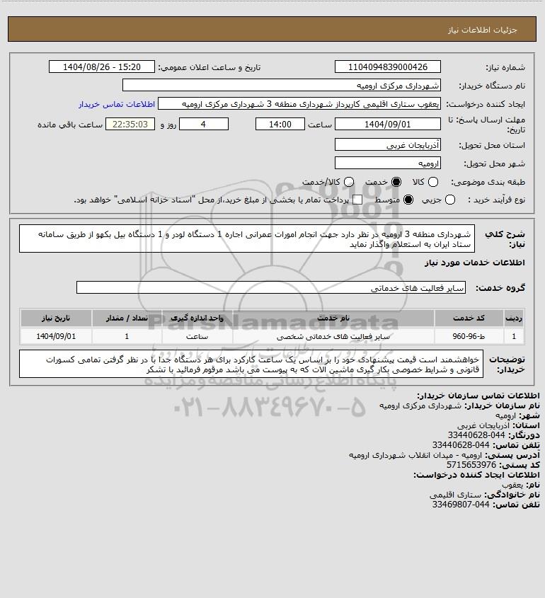 تلفن:5- 88349670 (021) فکس: 88349673 (021) Website: www.ParsNamadData.com E-mail: Info@ParsNamadData.com استعلام شهرداری منطقه 3 ارومیه در نظر دارد جهت انجام امورات عمرانی اجاره 1 دستگاه لودر و 1 دستگاه بیل بکهو از طریق سامانه ستاد ایران به استعلام واگذار نماید
