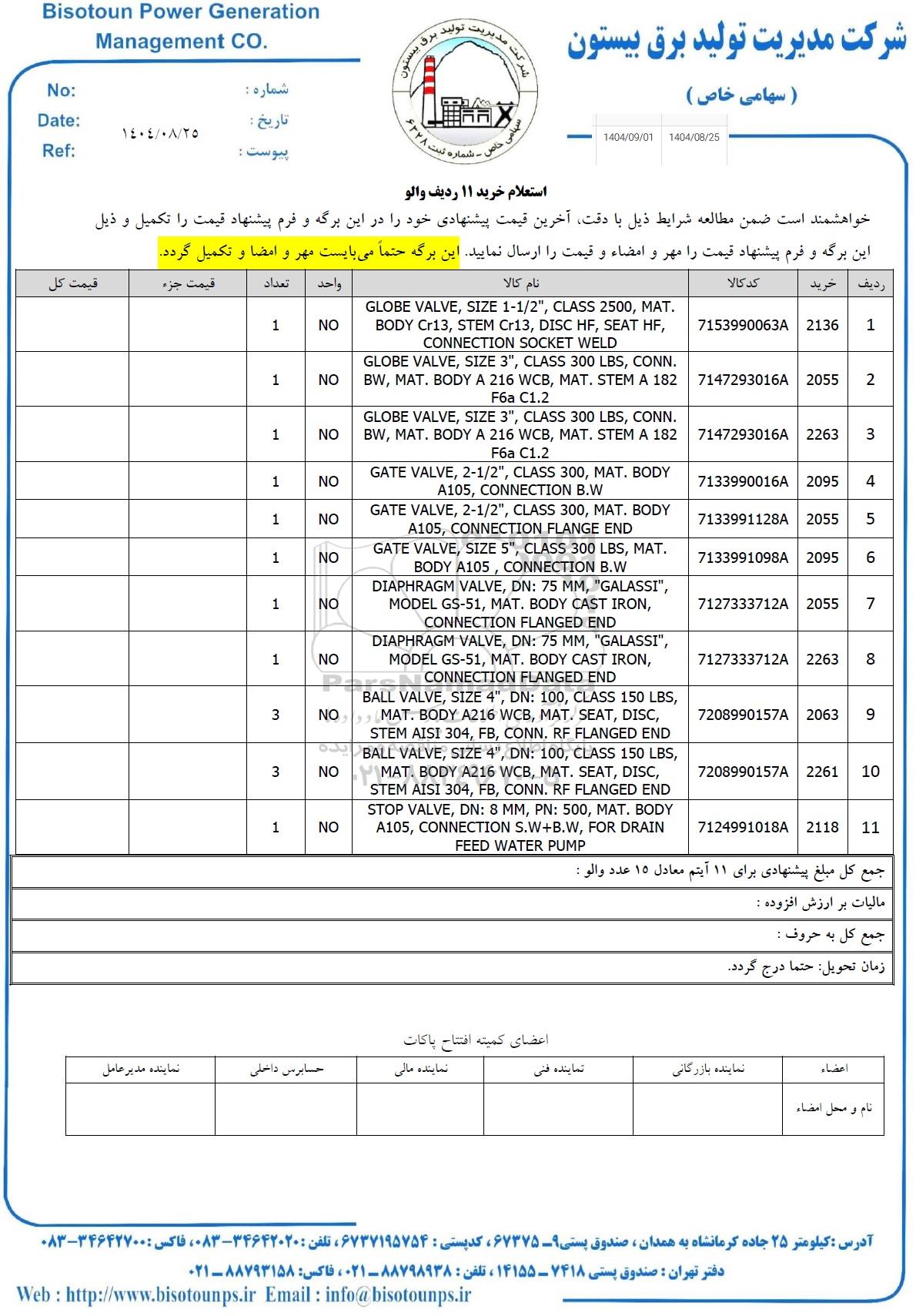 | عنوان آگهی: استعلام خرید 11 ردیف والو |