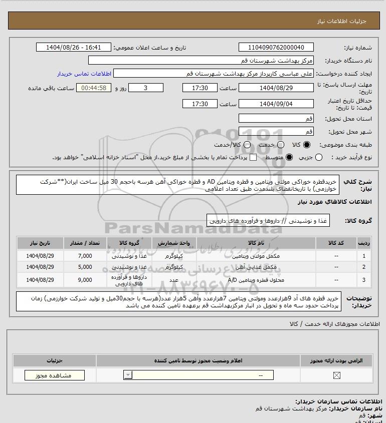 تلفن:5- 88349670 (021) فکس: 88349673 (021) Website: www.ParsNamadData.com E-mail: Info@ParsNamadData.com استعلام خریدقطره خوراکی مولتی ویتامین و قطره ویتامین AD و قطره خوراکی آهن هرسه باحجم 30 میل ساخت ایران(**شرکت خوارزمی) با تاریخانقضای بلندمدت طبق تعداد اعلامی