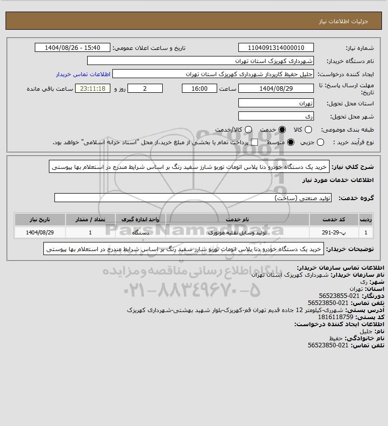تلفن:5- 88349670 (021) فکس: 88349673 (021) Website: www.ParsNamadData.com E-mail: Info@ParsNamadData.com استعلام خرید یک دستگاه خودرو دنا پلاس اتومات توربو شارز سفید رنگ بر اساس شرایط مندرج در استعلام بها پیوستی