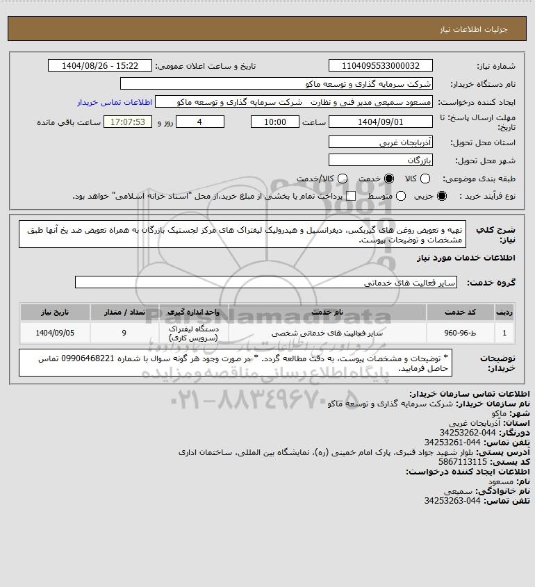 تلفن:5- 88349670 (021) فکس: 88349673 (021) Website: www.ParsNamadData.com E-mail: Info@ParsNamadData.com استعلام تهیه و تعویض روغن های گیربکس دیفرانسیل و هیدرولیک لیفتراک های مرکز لجستیک بازرگان به همراه تعویض ضد یخ آنها طبق مشخصات و توضیحات پیوست.