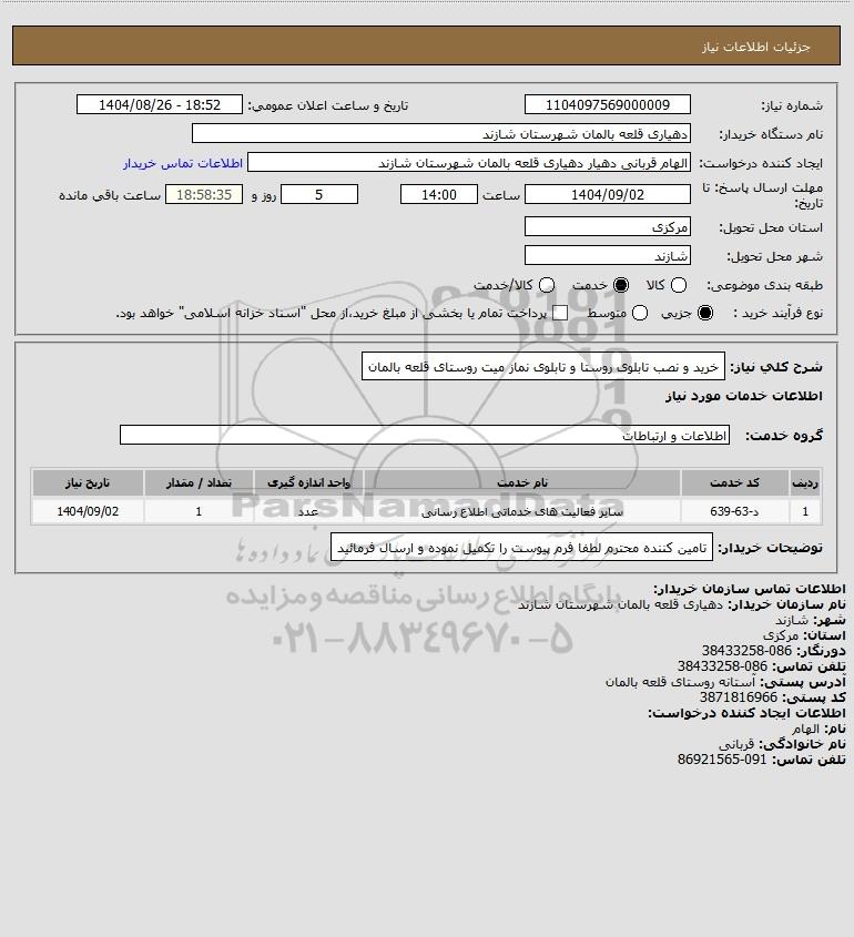 تلفن:5- 88349670 (021) فکس: 88349673 (021) Website: www.ParsNamadData.com E-mail: Info@ParsNamadData.com استعلام خرید و نصب تابلوی روستا و تابلوی نماز میت روستای قلعه بالمان