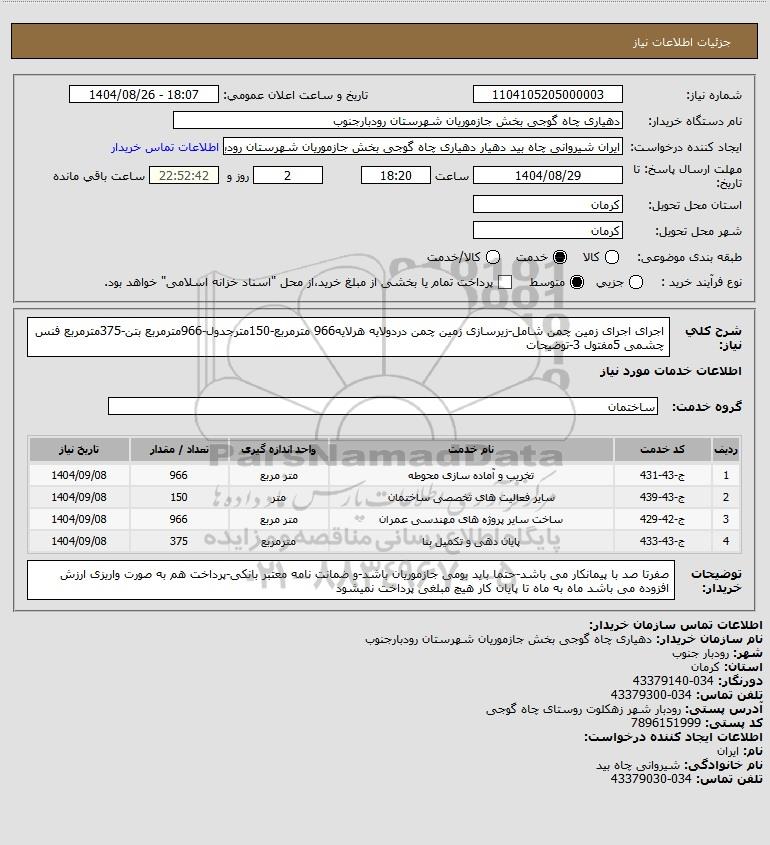 تلفن:5- 88349670 (021) فکس: 88349673 (021) Website: www.ParsNamadData.com E-mail: Info@ParsNamadData.com استعلام اجرای اجرای زمین چمن شامل-زیرسازی زمین چمن دردولایه هرلایه966 مترمربع-150مترجدول-966مترمربع بتن-375مترمربع فنس چشمی 5مفتول 3-توضیحات