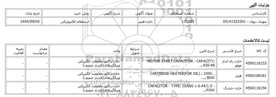 تلفن:5- 88349670 (021) فکس: 88349673 (021) Website: www.ParsNamadData.com E-mail: Info@ParsNamadData.com استعلام الکترونیکی خازن-هیتر