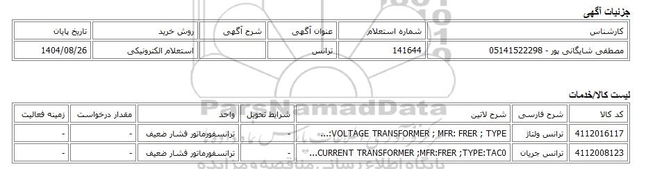 تلفن:5- 88349670 (021) فکس: 88349673 (021) Website: www.ParsNamadData.com E-mail: Info@ParsNamadData.com استعلام الکترونیکی ترانس