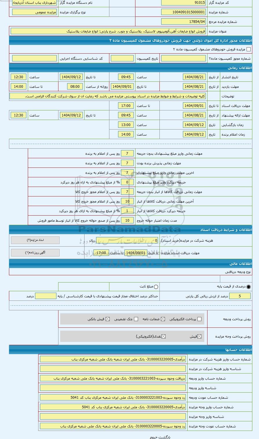 تلفن:5- 88349670 (021) فکس: 88349673 (021) Website: www.ParsNamadData.com E-mail: Info@ParsNamadData.com مزایده انواع ضایعات پلاستیک