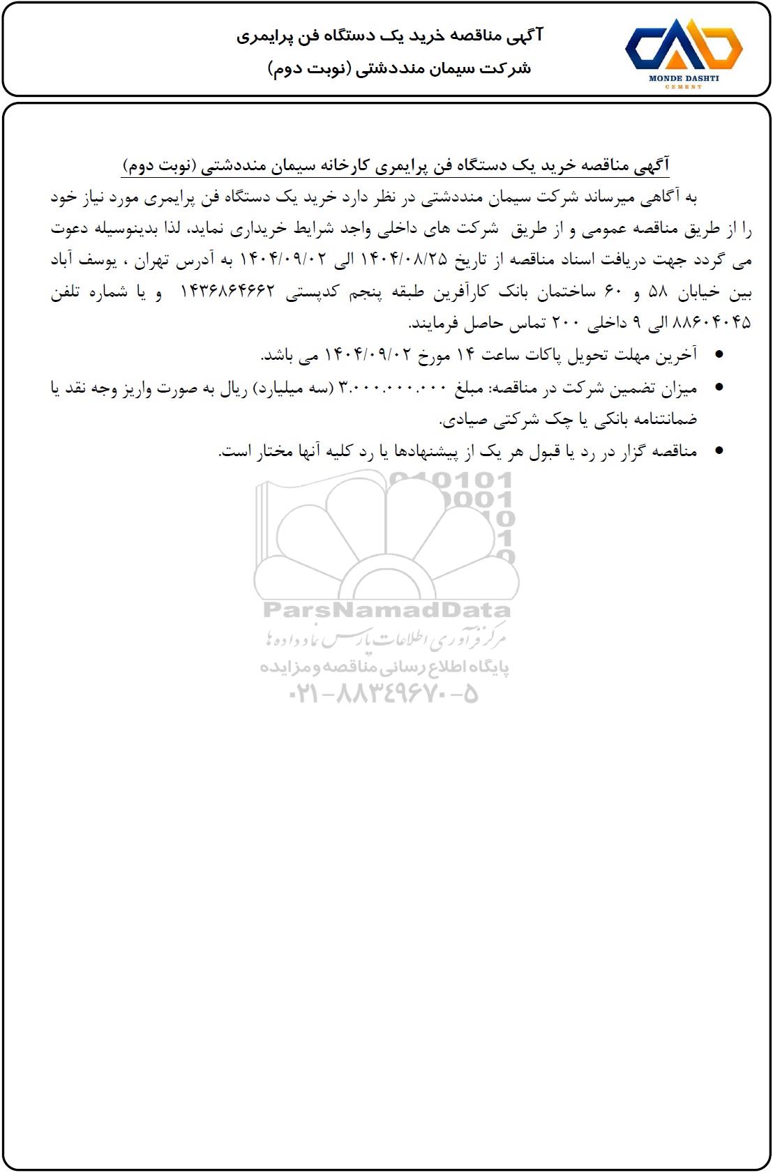 تلفن:5- 88349670 (021) فکس: 88349673 (021) Website: www.ParsNamadData.com E-mail: Info@ParsNamadData.com مناقصه خرید یک دستگاه فن پرایمری - نوبت دوم