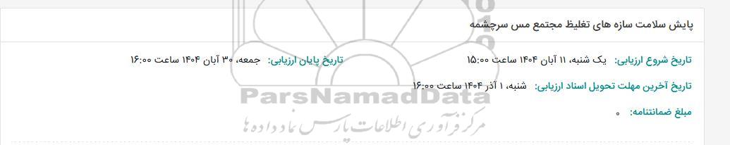 تلفن:5- 88349670 (021) فکس: 88349673 (021) Website: www.ParsNamadData.com E-mail: Info@ParsNamadData.com مناقصه پایش سلامت سازه های تغلیظ مجتمع مس سرچشمه