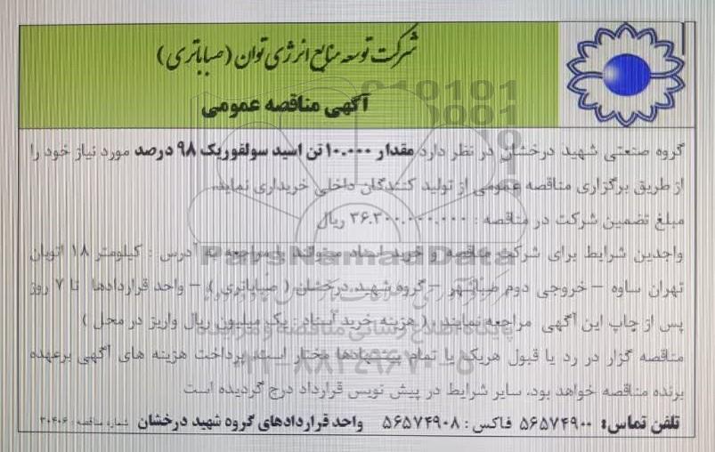 تلفن:5- 88349670 (021) فکس: 88349673 (021) Website: www.ParsNamadData.com E-mail: Info@ParsNamadData.com مناقصه عمومی مقدار 10.000 تن اسید سولفوریک 98 درصد