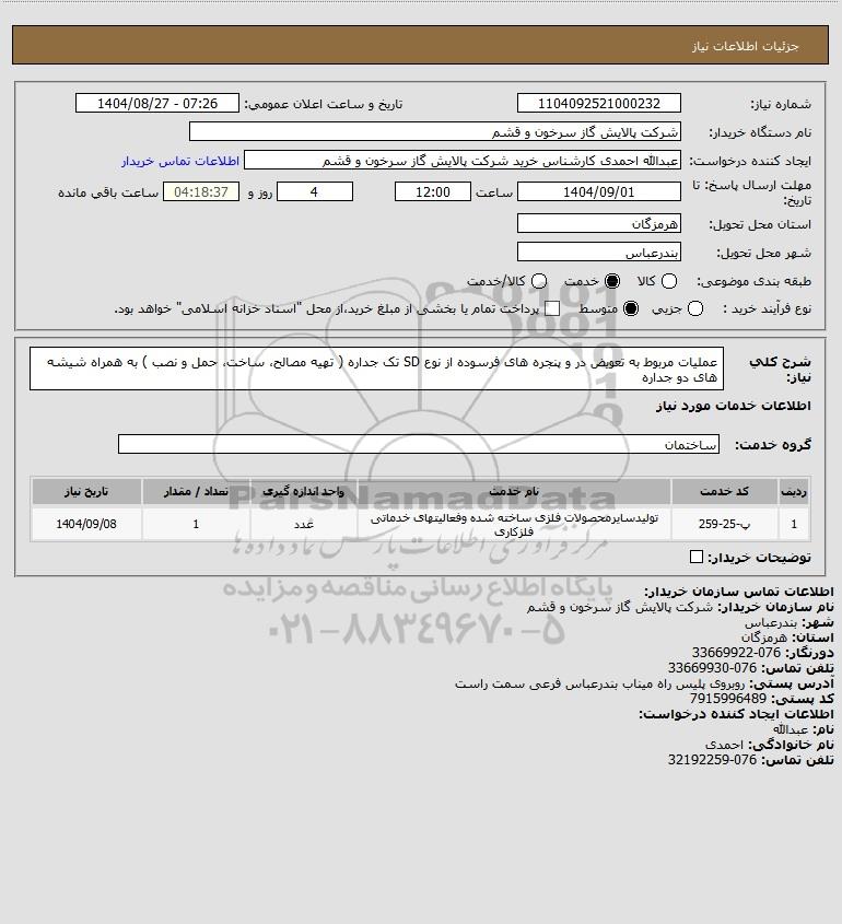 تلفن:5- 88349670 (021) فکس: 88349673 (021) Website: www.ParsNamadData.com E-mail: Info@ParsNamadData.com استعلام عملیات مربوط به تعویض در و پنجره های فرسوده از نوع SD تک جداره ( تهیه مصالح ساخت حمل و نصب ) به همراه شیشه های دو جداره