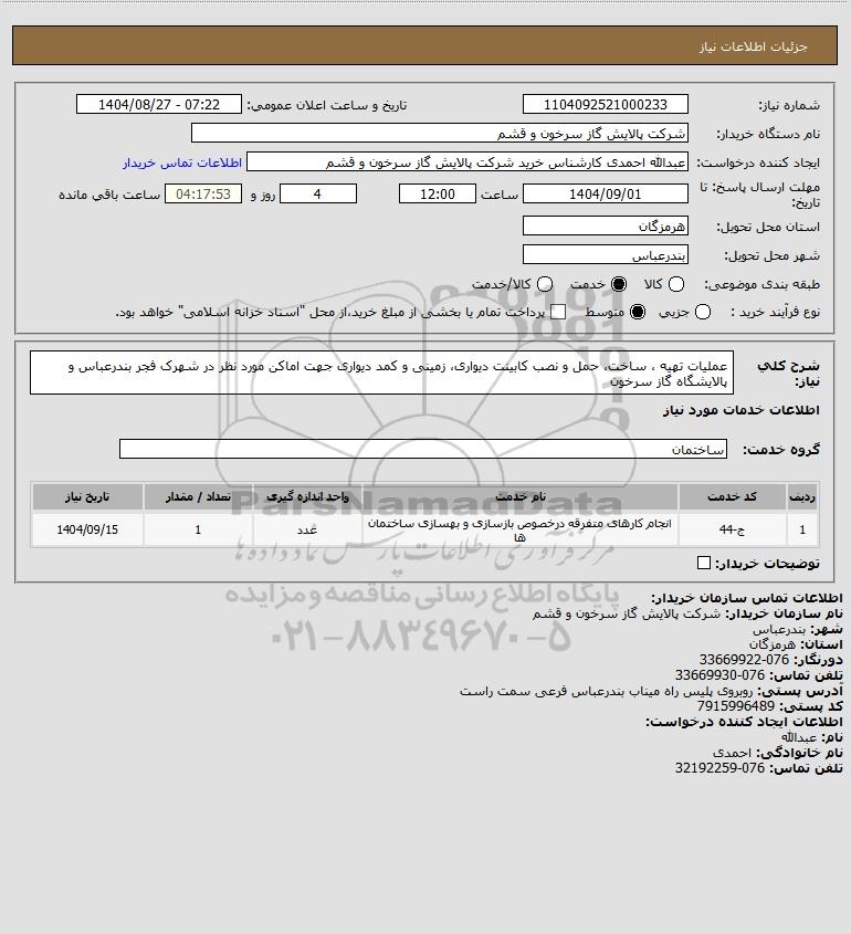 تلفن:5- 88349670 (021) فکس: 88349673 (021) Website: www.ParsNamadData.com E-mail: Info@ParsNamadData.com استعلام عملیات تهیه ساخت حمل و نصب کابینت دیواری زمینی و کمد دیواری جهت اماکن مورد نظر در شهرک فجر بندرعباس و پالایشگاه گاز سرخون