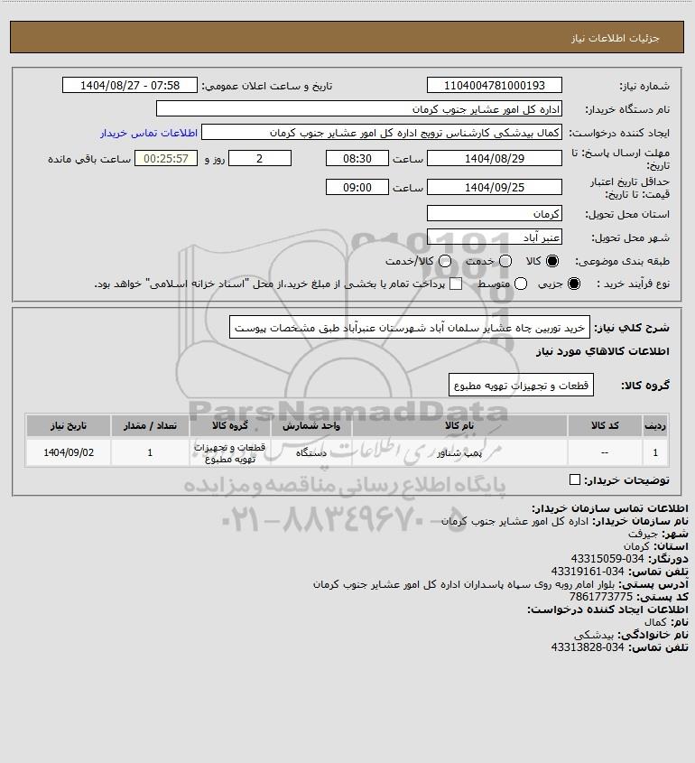 تلفن:5- 88349670 (021) فکس: 88349673 (021) Website: www.ParsNamadData.com E-mail: Info@ParsNamadData.com استعلام خرید توربین چاه عشایر سلمان آباد شهرستان عنبرآباد طبق مشخصات پیوست