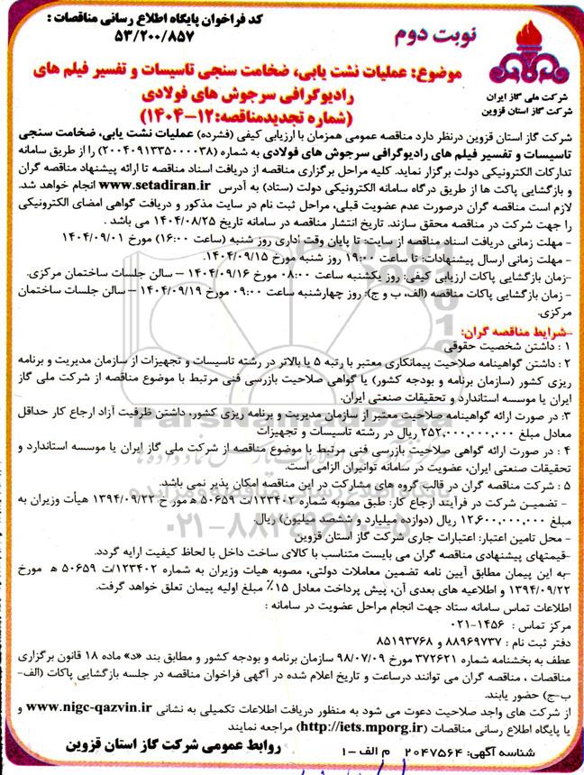 موضوع: عملیات نشت یابی، ضخامت سنجی تاسیسات و تفسیر فیلم های رادیوگرافی سرجوش های فولادی (شماره تجدید مناقصه : 12-1404)