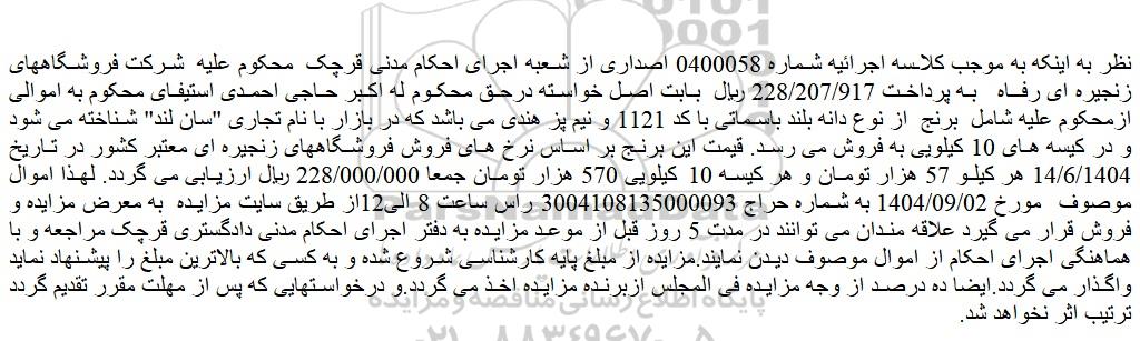 نظر به اینکه به موجب کلاسه اجرائیه شماره 0400058 اصداری از شعبه اجرای احکام مدنی قرچک محکوم علیه شرکت فروشگاههای زنجیره ای رفاه به پرداخت 228/207/917 ریال بابت اصل خواسته درحق محکوم له اکبر حاجی احمدی استیفای محکوم به اموالی ازمحکوم علیه شامل برنج از نوع دانه بلند باسماتی با کد 1121 و نیم پز هندی می باشد که در بازار با نام تجاری "سان لند" شناخته می شود و در کیسه های 10 کیلویی به فروش می رسد. قیمت این برنج بر اساس نرخ های فروش فروشگاههای زنجیره ای معتبر کشور در تاریخ 14/6/1404 هر کیلو 57 هزار تومان و هر کیسه 10 کیلویی 570 هزار تومان جمعا 228/000/000 ریال ارزیابی می گردد. لهذا اموال موصوف مورخ 1404/09/02 به شماره حراج 3004108135000093 راس ساعت 8 الی12از طریق سایت مزایده به معرض مزایده و فروش قرار می گیرد علاقه مندان می توانند در مدت 5 روز قبل از موعد مزایده به دفتر اجرای احکام مدنی دادگستری قرچک مراجعه و با هماهنگی اجرای احکام از اموال موصوف دیدن نمایند.مزایده از مبلغ پایه کارشناسی شروع شده و به کسی که بالاترین مبلغ را پیشنهاد نماید واگذار می گردد.ایضا ده درصد از وجه مزایده فی المجلس ازبرنده مزایده اخذ می گردد.و درخواستهایی که پس از مهلت مقرر تقدیم گردد ترتیب اثر نخواهد شد.