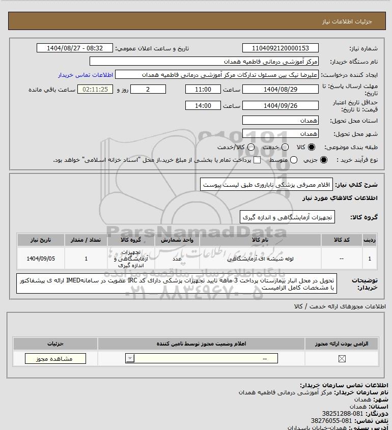 تلفن:5- 88349670 (021) فکس: 88349673 (021) Website: www.ParsNamadData.com E-mail: Info@ParsNamadData.com استعلام اقلام مصرفی پزشکی ناباروری طبق لیست پیوست