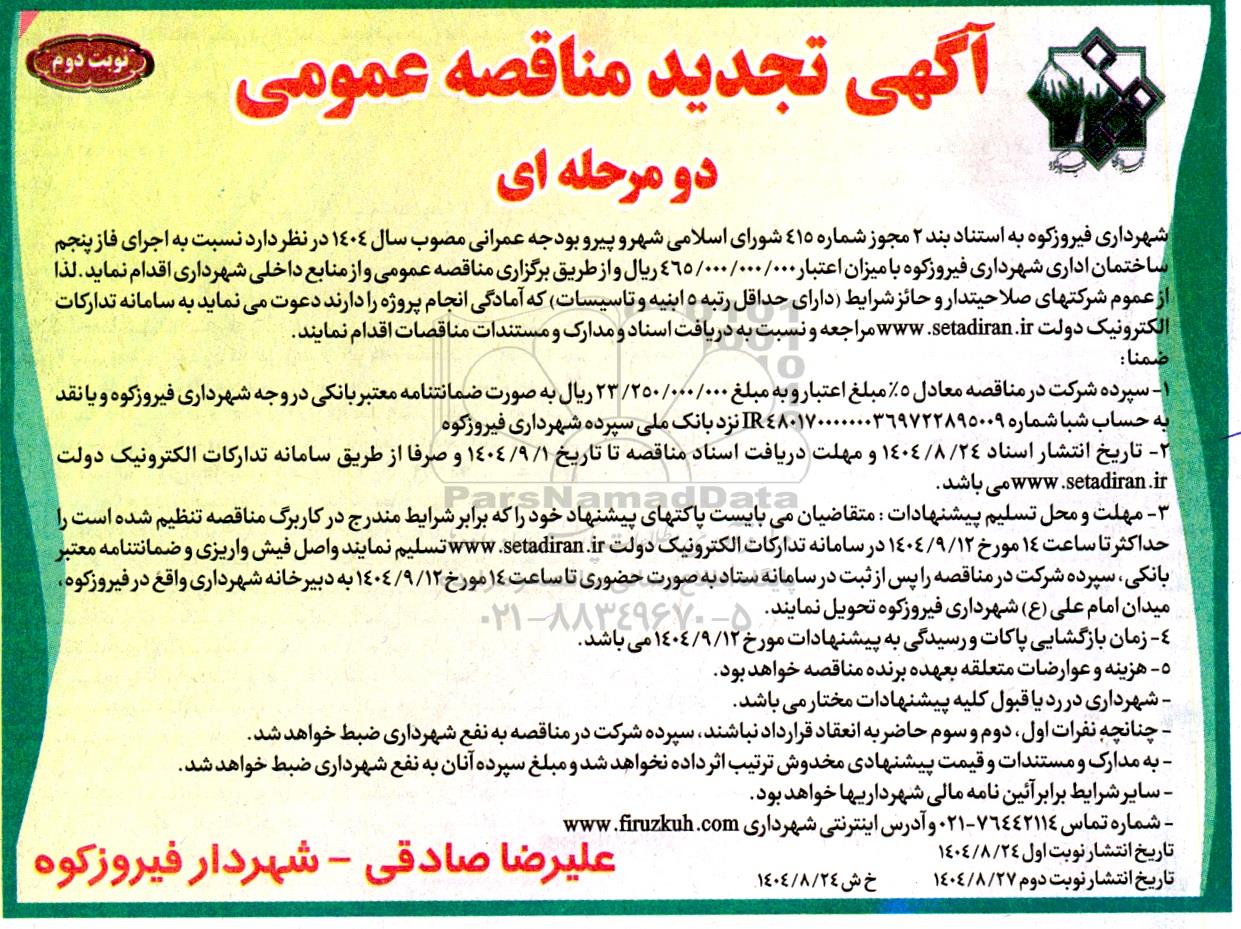 شهرداری فیروزکوه به استناد بند 2 مجوز شماره 415 شورای اسلامی شهر و پیرو بودجه عمرانی مصوب سال 1404 در نظر دارد نسبت به اجرای فاز پنجم ساختمان اداری شهرداری فیروزکوه با میزان اعتبار 465.000.000.000 ریال و از طریق برگزاری مناقصه عمومی و از منابع داخلی شهرداری اقدام نماید. لذا از عموم شرکتهای صلاحیتدار و حائز شرایط (دارای حداقل رتبه 5 ابنیه و تاسیسات ) که آمادگی انجام پروژه را دارند دعوت می نماید به سامانه تدارکات الکترونیک دولت ستاد ایران مراجعه و نسبت به دریافت اسناد و مدارک و مستندات مناقصات اقدام نمایند.