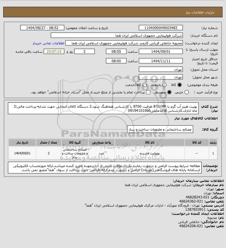تلفن:5- 88349670 (021) فکس: 88349673 (021) Website: www.ParsNamadData.com E-mail: Info@ParsNamadData.com استعلام یونیت هیتر آب گرم با BTU/HR ظرفیت 9700 با کارشناس هماهنگ شود.2 دستگاه کالای انتخابی جهت تشابه-پرداخت مالی:2 ماه اداری.کارشناس آقای مایلی09194101066
