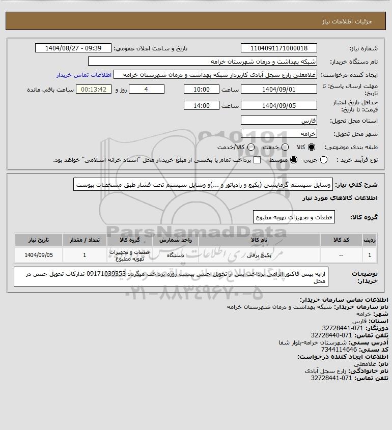 تلفن:5- 88349670 (021) فکس: 88349673 (021) Website: www.ParsNamadData.com E-mail: Info@ParsNamadData.com استعلام وسایل سیستم گرمایشی (پکیج و رادیاتور و ...)و وسایل سیستم تحت فشار طبق مشخصات پیوست