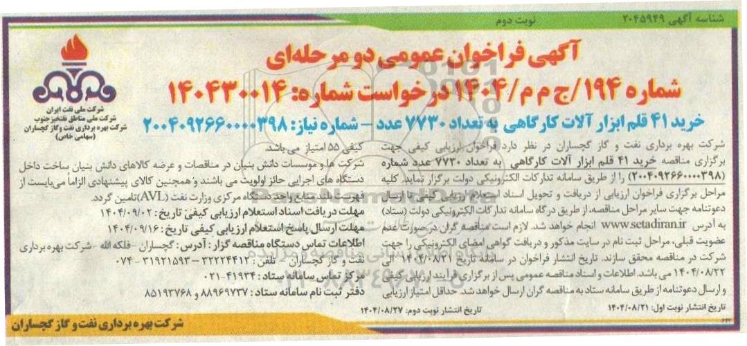 شرکت بهره برداری نفت و گاز گچساران در نظر دارد فراخوان ارزیابی کیفی جهت برگزاری مناقصه خرید 41 قلم ابزار آلات کارگاهی به تعداد 7730 عدد شماره (2004092660000398) را از طریق سامانه تدارکات الکترونیکی دولت برگزار نماید. کلیه مراحل برگزاری فراخوان ارزیابی از دریافت و تحویل اسناد استعلام ارزیابی کیفی تا ارسال دعوتنامه جهت سایر مراحل مناقصه از طریق درگاه سامانه تدارکات الکترونیکی دولت (ستاد) انجام خواهد شد لازم است مناقصه گران در صورت عدم عضویت قبلی مراحل ثبت نام در سایت مذکور و دریافت گواهی امضای الکترونیکی را جهت شرکت در مناقصه محقق سازند تاریخ انتشار فراخوان در سامانه تاریخ 1404.08.21 الی 1404.08.22 میباشد اطلاعات و اسناد مناقصه عمومی پس از برگزاری فرآیند ارزیابی کیفی و ارسال دعوتنامه از طریق سامانه ستاد به مناقصه گران ارسال خواهد شد. حداقل امتیاز ارزیابی کیفی 55 امتیاز می باشد.