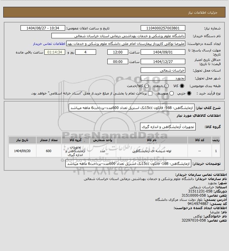 تلفن:5- 88349670 (021) فکس: 88349673 (021) Website: www.ParsNamadData.com E-mail: Info@ParsNamadData.com استعلام ازمایشگاهی- 168- فالکون 15ccتک استریل تعداد 600عدد--پرداخت6 ماهه میباشد