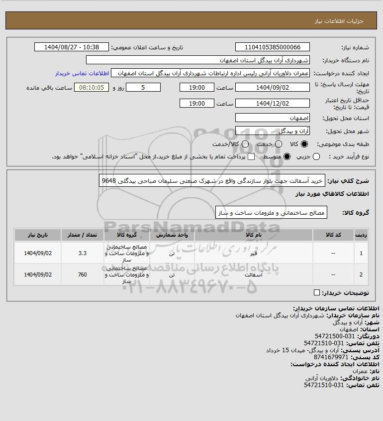 تلفن:5- 88349670 (021) فکس: 88349673 (021) Website: www.ParsNamadData.com E-mail: Info@ParsNamadData.com استعلام خرید آسفالت جهت بلوار سازندگی واقع در شهرک صنعتی سلیمان صباحی بیدگلی 9648