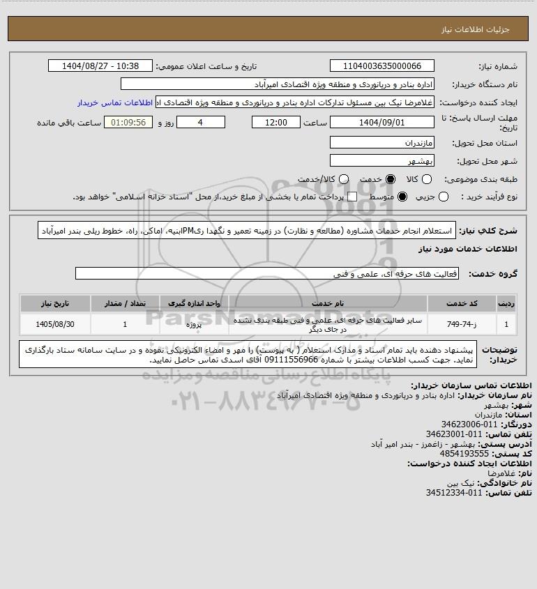 تلفن:5- 88349670 (021) فکس: 88349673 (021) Website: www.ParsNamadData.com E-mail: Info@ParsNamadData.com استعلام استعلام انجام خدمات مشاوره (مطالعه و نظارت) در زمینه تعمیر و نگهدا ریPMابنیه اماکن راه خطوط ریلی بندر امیرآباد