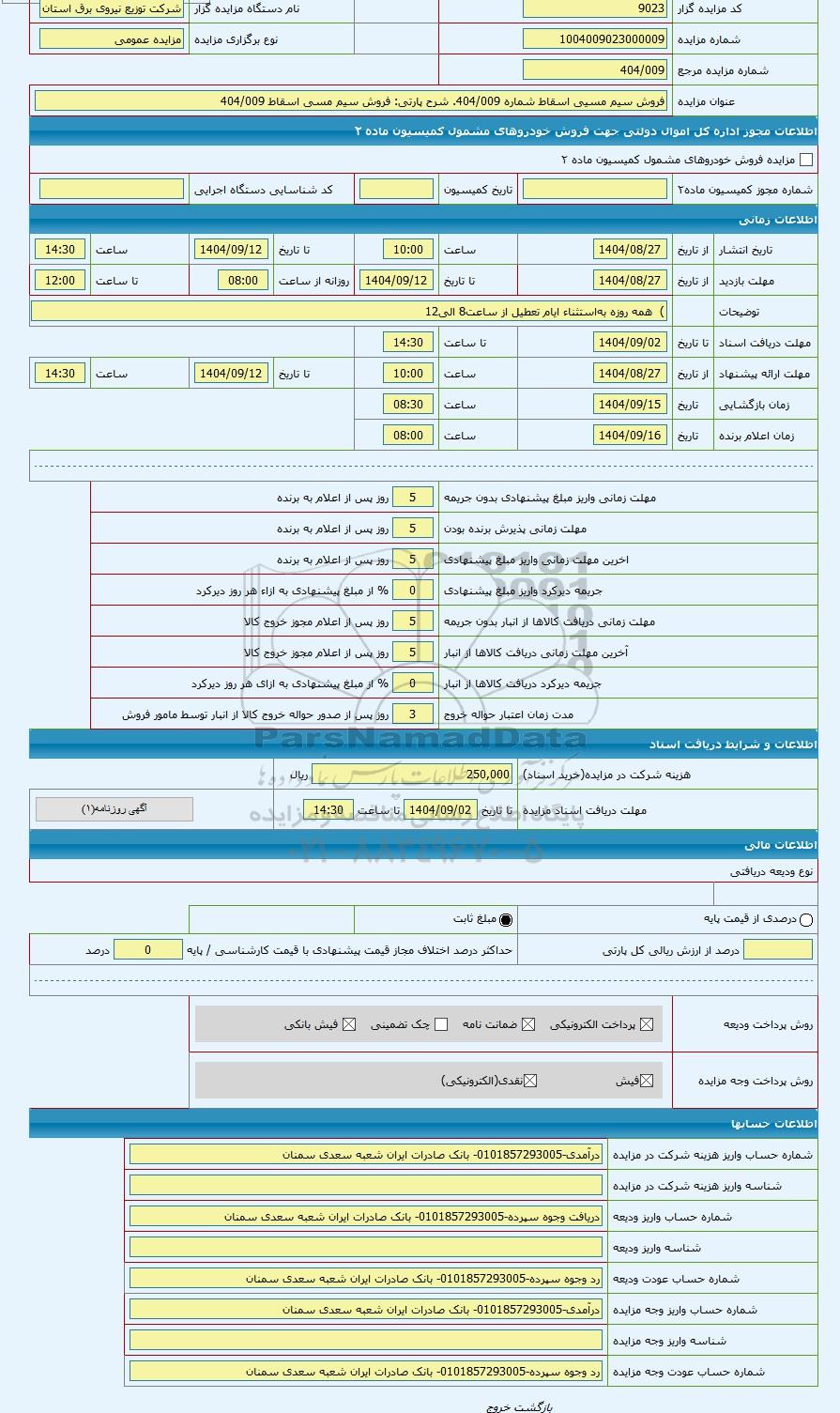 تلفن:5- 88349670 (021) فکس: 88349673 (021) Website: www.ParsNamadData.com E-mail: Info@ParsNamadData.com مزایده فروش سیم مسی اسقاط 404/009