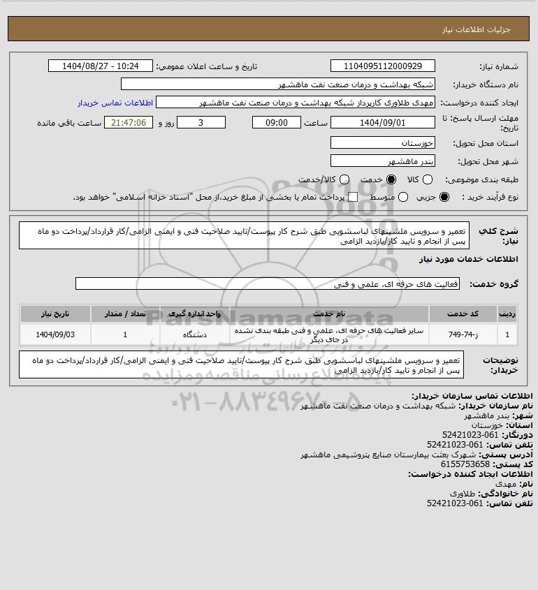تلفن:5- 88349670 (021) فکس: 88349673 (021) Website: www.ParsNamadData.com E-mail: Info@ParsNamadData.com استعلام تعمیر و سرویس ملشینهای لباسشویی طبق شرح کار پیوست/تایید صلاحیت فنی و ایمنی الزامی/کار قرارداد/پرداخت دو ماه پس از انجام و تایید کار/بازدید الزامی