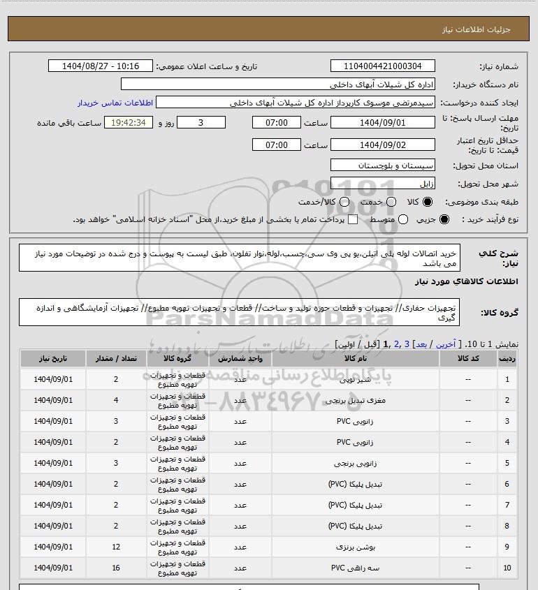 تلفن:5- 88349670 (021) فکس: 88349673 (021) Website: www.ParsNamadData.com E-mail: Info@ParsNamadData.com استعلام خرید اتصالات لوله پلی اتیلنیو پی وی سیچسبلولهنوار تفلون طبق لیست به پیوست و درج شده در توضیحات مورد نیاز می باشد