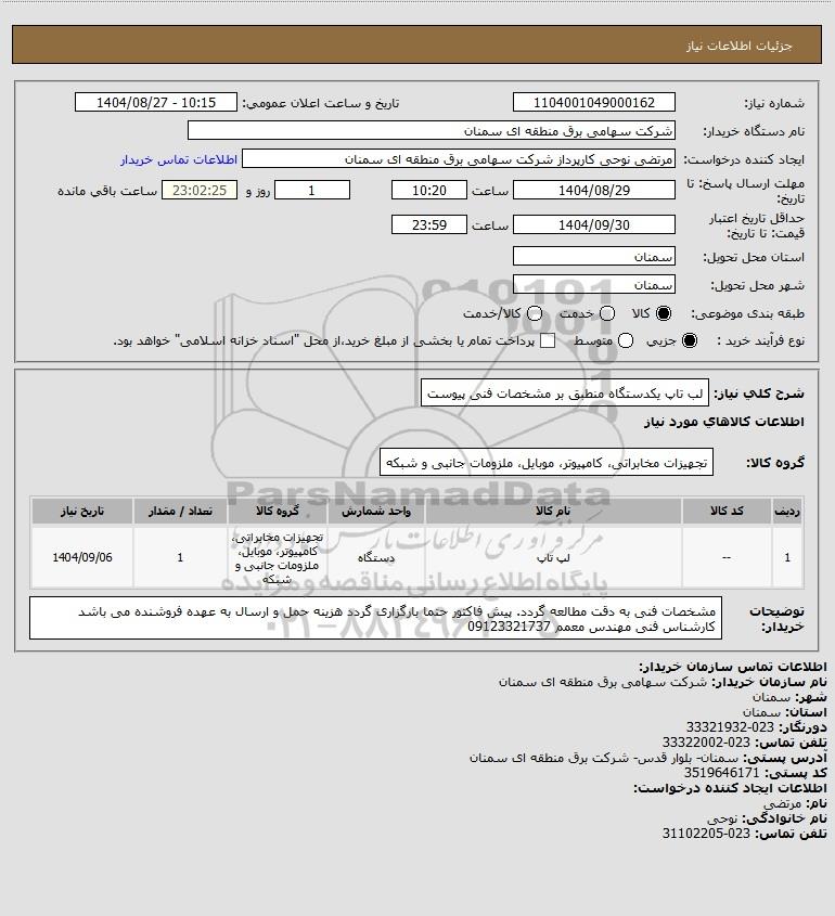 تلفن:5- 88349670 (021) فکس: 88349673 (021) Website: www.ParsNamadData.com E-mail: Info@ParsNamadData.com استعلام لب تاپ یکدستگاه منطبق بر مشخصات فنی پیوست