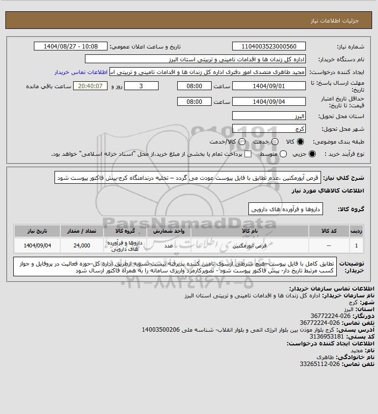 تلفن:5- 88349670 (021) فکس: 88349673 (021) Website: www.ParsNamadData.com E-mail: Info@ParsNamadData.com استعلام قرص آیورمکتین عدم تطابق با فایل پیوست عودت می گردد – تخلیه درندامتگاه کرج-پیش فاکتور پیوست شود