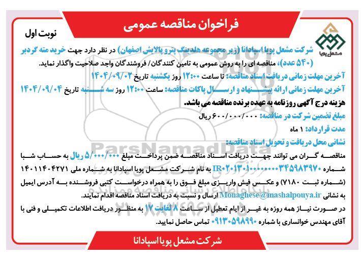 شرکت مشعل پویا اسپادانا (زیر مجموعه هلدینگ پترو پالایش اصفهان) در نظر دارد جهت خرید مته گردبر (540 عدد)، مناقصه ای را به روش عمومی به تامین کنندگان / فروشندگان واجد صلاحیت واگذار نماید.