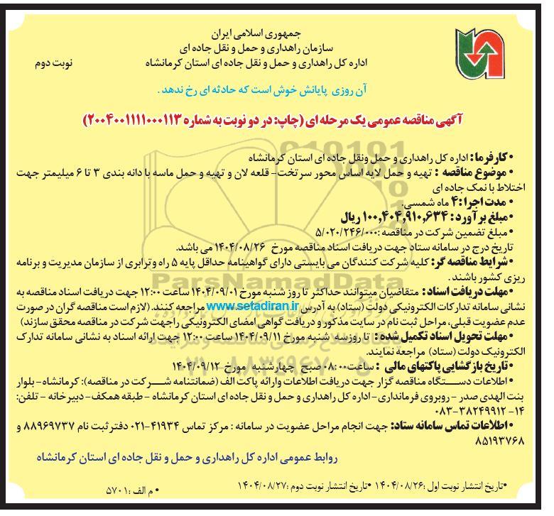 آگهی گزار اداره کل راهداری و حمل و نقل جاده ای استان کرمانشاه