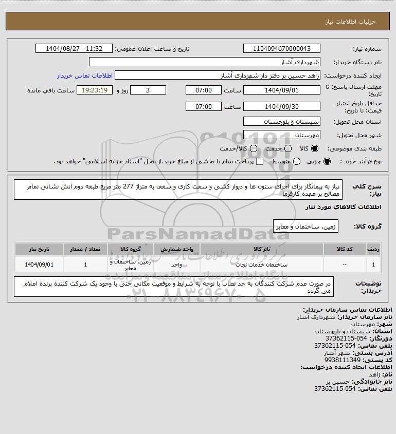 تلفن:5- 88349670 (021) فکس: 88349673 (021) Website: www.ParsNamadData.com E-mail: Info@ParsNamadData.com استعلام نیاز به پیمانکار برای اجرای ستون ها و دیوار کشی و سفت کاری و سقف به متراژ 277 متر مربع طبقه دوم اتش نشانی تمام مصالح بر عهده کارفرما