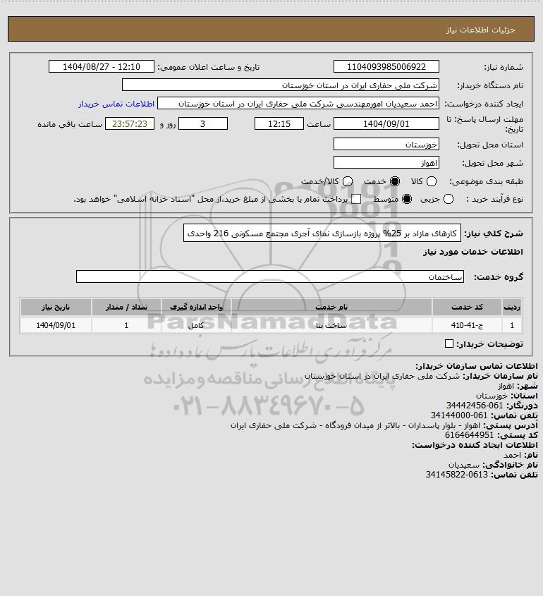 تلفن:5- 88349670 (021) فکس: 88349673 (021) Website: www.ParsNamadData.com E-mail: Info@ParsNamadData.com استعلام کارهای مازاد بر 25% پروژه بازسازی نمای آجری مجتمع مسکونی 216 واحدی