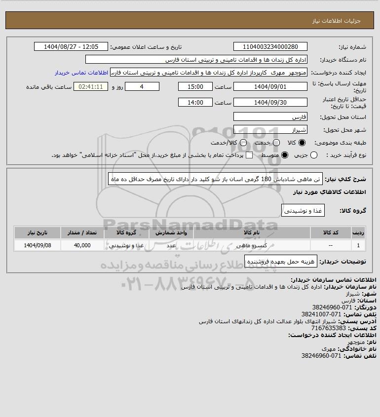 تلفن:5- 88349670 (021) فکس: 88349673 (021) Website: www.ParsNamadData.com E-mail: Info@ParsNamadData.com استعلام تن ماهی شادباش 180 گرمی اسان باز شو کلید دار دارای تاریخ مصرف حداقل ده ماه